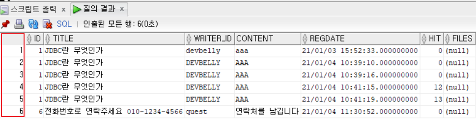 SELECT를 사용하여 결과집합을 조회하게 되면 만들지 않은 ROWNUM이 자동으로 생기게 됩니다. 왼쪽에 있는 빨간색 사각형이 ROWNUM에 해당하는 부분입니다.
