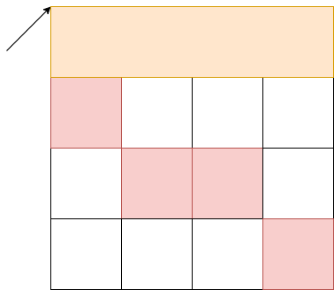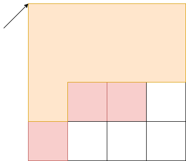그림을 통해 다시 보겠습니다. 빨간색 부분은 포함해서는 안되는 부분입니다. 예를 들어 화살표가 가리키는 부분이 맨 위의 변과 왼쪽변을 가리키는 i, j라고 하면 우측변 k마다 top100[i][k]값을 알고 있다면 topdark[i][k]와 top100[i][k]의 값을 빼면 i,j,k 변에서 만들 수 있는 직사각형의 갯수를 바로 구할 수 있습니다. 이 행동을 k가 맨 오른쪽에 도달할때까지 한다면 $O(N^3)$에 원하는 값을 구할 수 있습니다. 유의할점은 다음과 같은 상황입니다.