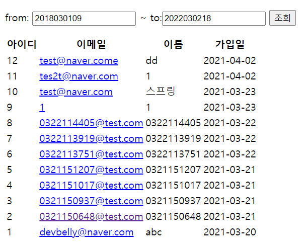 커맨드 객체에 정보가 있을 때만 Model객체에 결과값을 담아 뷰 페이지에 출력하도록 했습니다. 즉 처음에 /컨텍스트경로/members 에 접근하면 from과 to를 입력하기 위한 폼만 존재합니다.