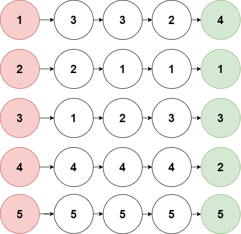 1번째 있는 소는 3, 3, 2 번째를 들른 후 한 사이클이 끝나면 4번째에 있는 곳에 위치하게 됩니다. 아래 2,3,4,5 번째 소들도 마찬가지로 그림을 해석하면 됩니다. 이 사이클을 계속 반복했을 때 원래 자리로 돌아오도록 시뮬레이션하면 답을 구할 수 있습니다. 아래 사진은 1번째소를 시뮬레이션한 결과입니다.