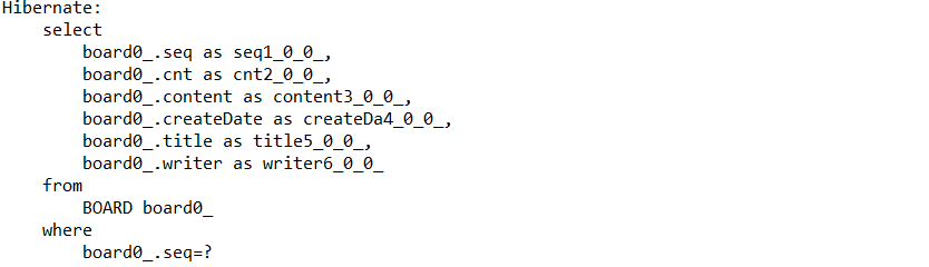 이를 실행하면 콘솔에서 H2 기반의 SQL들이 실행됨을 알 수 있습니다. 하지만 H2데이터베이스에 들어가서 BOARD 테이블을 조회해보면 아무런 값이 없는 것을 확인할 수 있습니다.