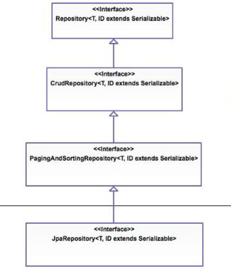 위 세 개는 스프링 데이터 모듈, 아래 JpaRepsitory는 스프링 데이터 JPA에서 제공하는 인터페이스입니다. 인터페이스들은 공통적으로 두 개의 제네릭 타입을 지정하게 됩니다. 첫 번째는 매핑할 엔티티 클래스를 적고 두 번째는 해당 엔티티의 Id 타입을 적게 됩니다.