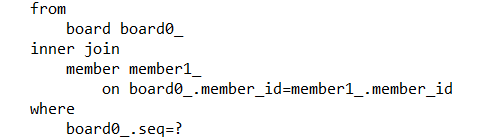 LEFT OUTER JOIN을 사용하는 모습입니다. 외부 조인은 내부 조인에 비해 성능이 떨어집니다. Driving Table을 기준으로 이중 포문을 사용하기 때문입니다. 만일 참조변수에 null이 들어와 있지 않는 것이 확실하다면 nullable 속성을 추가해주면 됩니다. 실행결과는 INNER JOIN입니다.