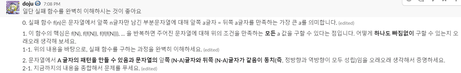 실패 함수의 다양한 특징들을 사용해서 푸는 문제입니다. 이 이상 어떻게 응용되는지는 모르겠으나, 제가 느끼기론 모든 성질을 다 사용한 것 같습니다. 이 문제에서 실패 함수를 $1-BASED$로 구현하게 되면 깔끔해지는 이유를 알 수 있습니다. 실패 함수의 특징에 대한 설명은 아래 사진으로 대체하겠습니다.